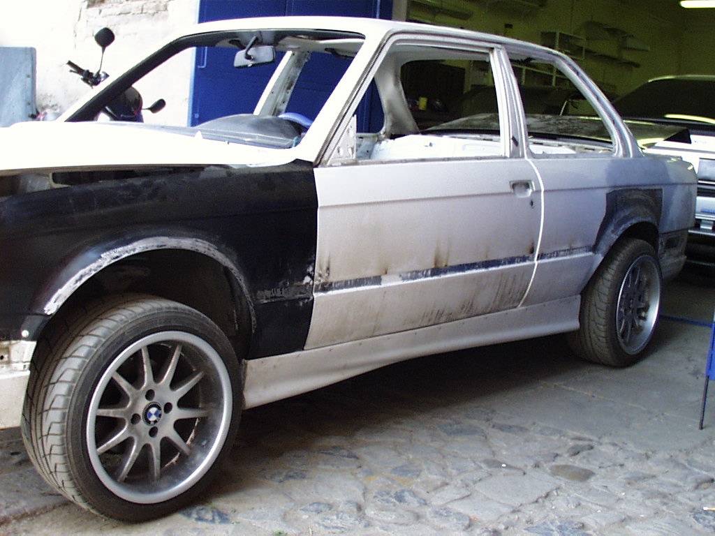 Hurá do lakovny, komplet odstrojeno! Interiér zatím byl u čalouníka na novém přehozu modrá a modřejší alcantara. Sportsitze jak nové. Do modré šel i tapecírunk! Komplet koberec zakoupen nový, včetně dalších nesmyslů, jako byla lišty kolem dveří a nějaké plasty a plastíky, co za dobu života někde odpadly. Zrcátka kopie M3 E36, přední světla Hella.